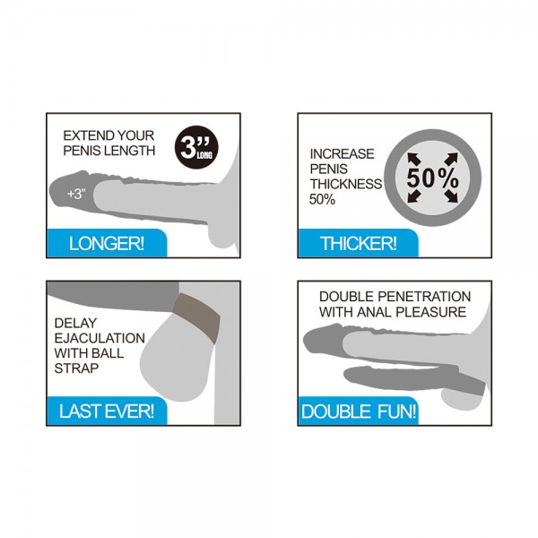 Насадка полая надевается на половой член, удлиняя его на 4см. Вся конструкция фиксируется при помощи кольца для мошонки, которое также усиливает ощущение мужчине и продлевает время полового акта!